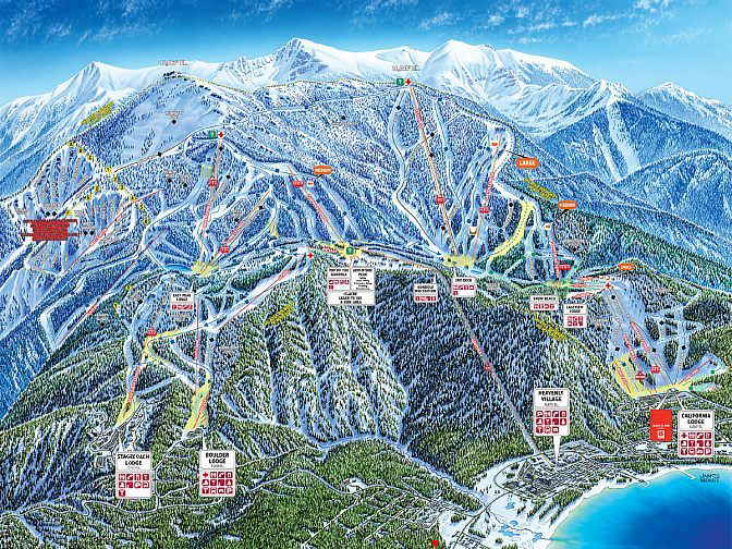 All level of skiers enjoy the breath taking panoramic views of Lake Tahoe to the north of the mountain and Carson Valley to the east. Expert skiers delight in the steep Gunbarrel and East Bowl runs under the tram from the California Lodge as well as the chutes and powder in Mott and Killebrew canyons on the Nevada side. Intermediates and beginners enjoy miles of wide, groomed trails in both states. And typical lift lines are less than one minute long! The season usually runs from late November to early May. The dining and nightlife are also superb with Tahoe's famous south shore casinos near the mountain base.